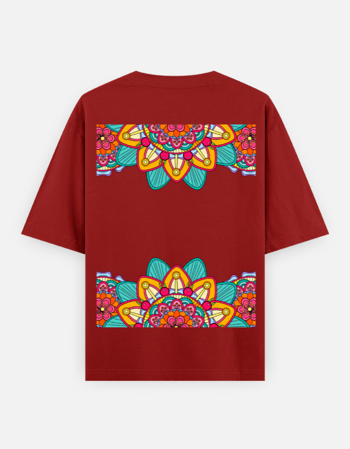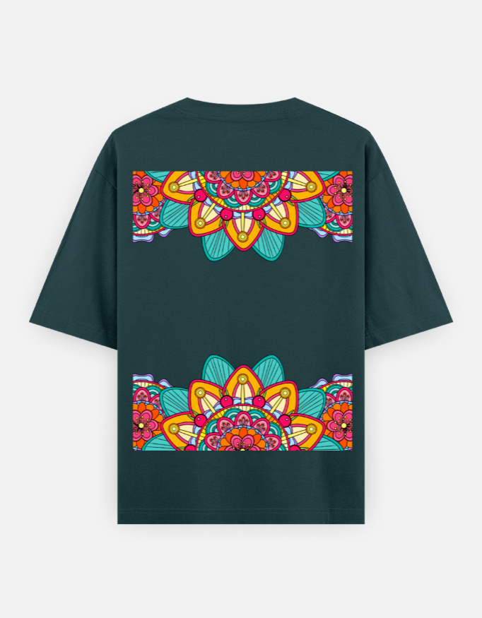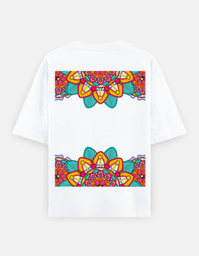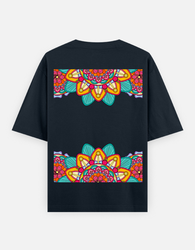 The centerpiece of this tee is the vibrant mandala design placed at the back—a kaleidoscope of colors representing harmony, balance, and infinite expansion. From behind, it radiates life, movement, and the flow of the cosmos—turning your every step into a living artwork.